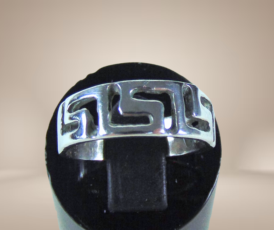 Mooie vintage zilveren ring met een opengewerkt Grieks meander patroon.