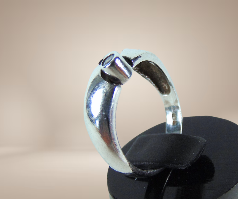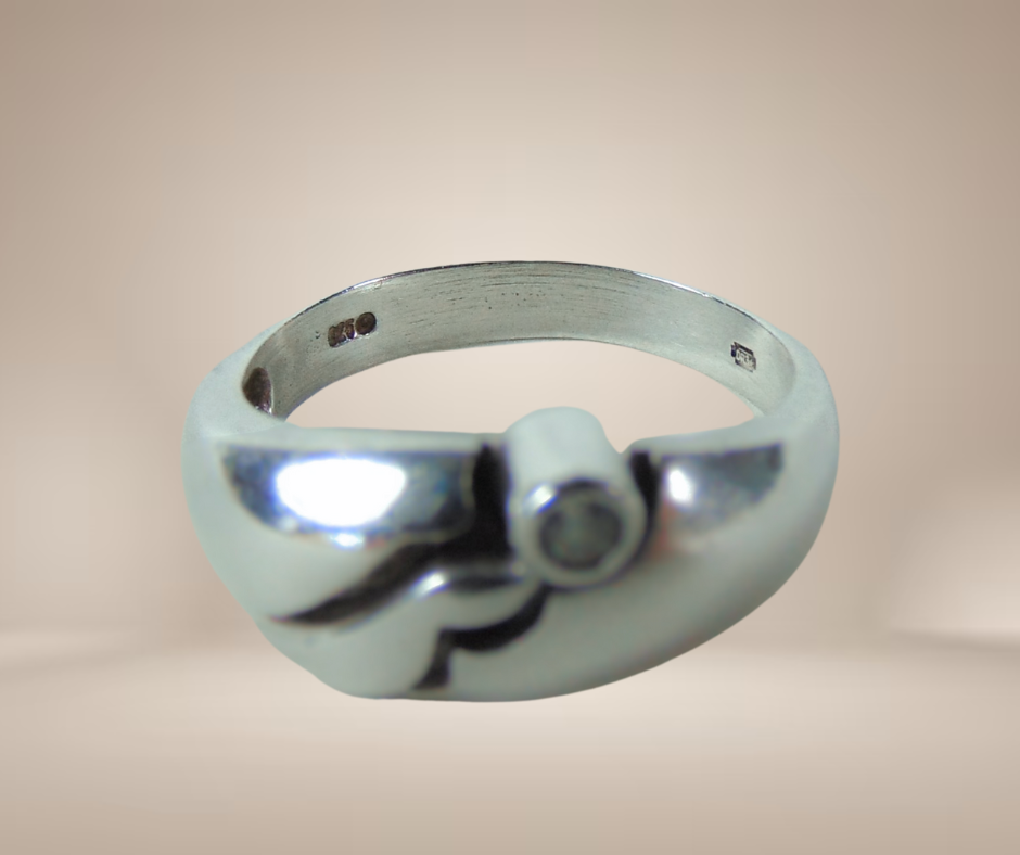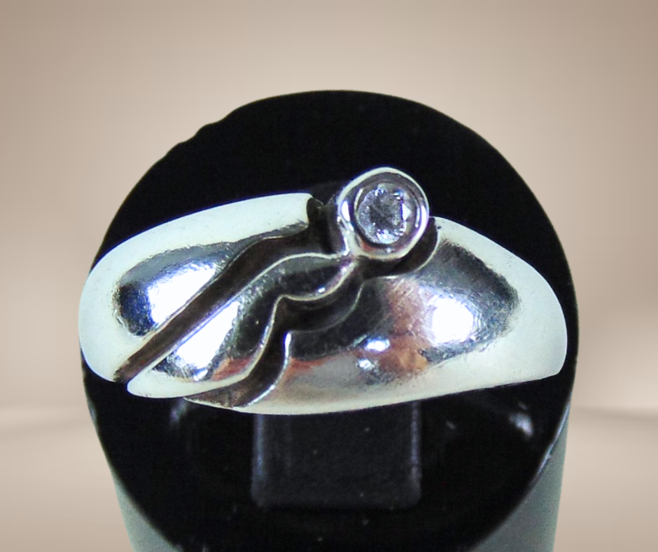 Prachtig vormgegeven zilveren ring uit de jaren 70 met een uitzonderlijk ontwerp. De gebolde ring is gezet met een zirkonia en loopt aan de voorzijde breder uit. Hij heeft 2 makersmerkjes, maar ik heb helaas niet kunnen vinden wie deze unieke ring heeft gemaakt.