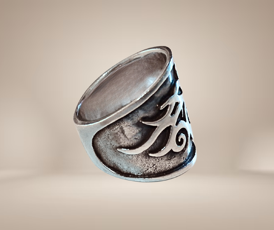 Schitterende grote nieuwe handgemaakt zilveren ring, gemerkt 925. Mooi bewerkt met glimmende tribal vlammen tegen een donker geoxideerde ondergrond. Laatste exemplaar!
