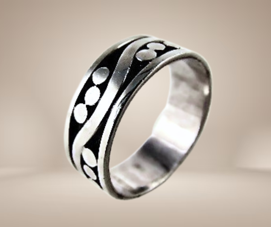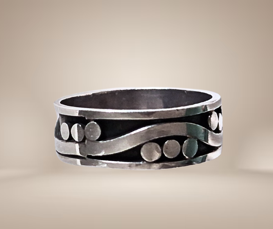 Mooie zilveren bandring, vormgegeven met strakke lijnen en stippen tegen een zwart geoxideerde achtergrond.