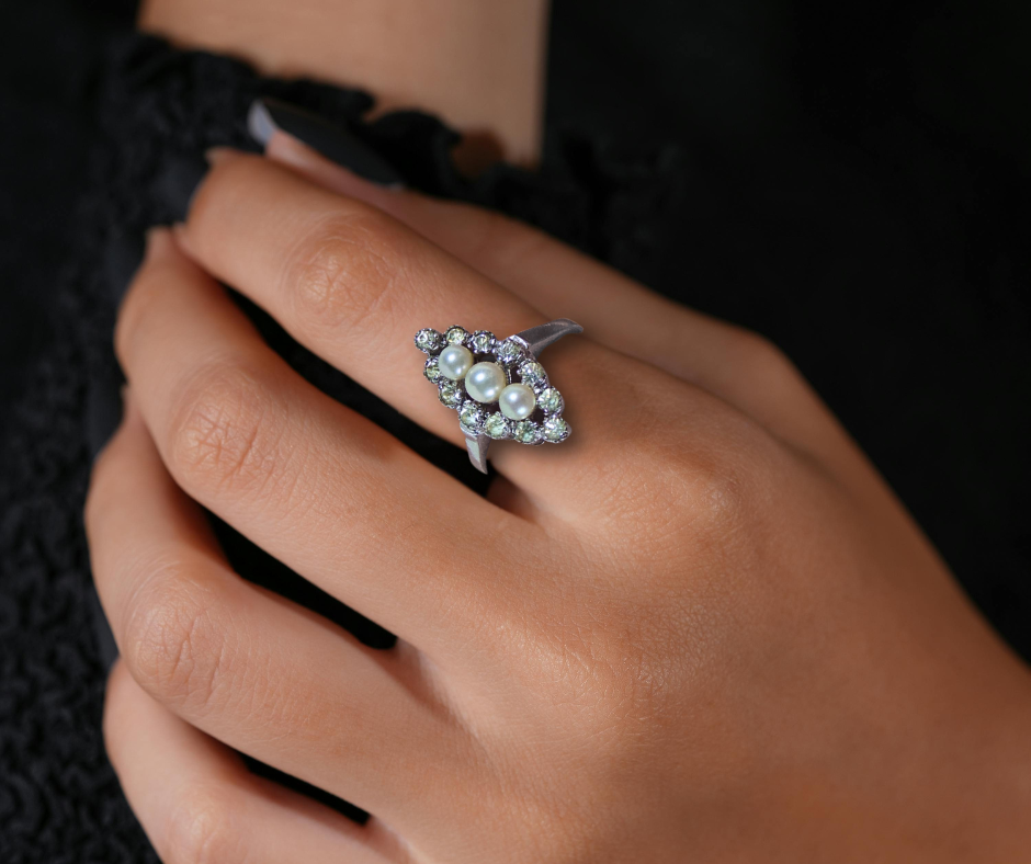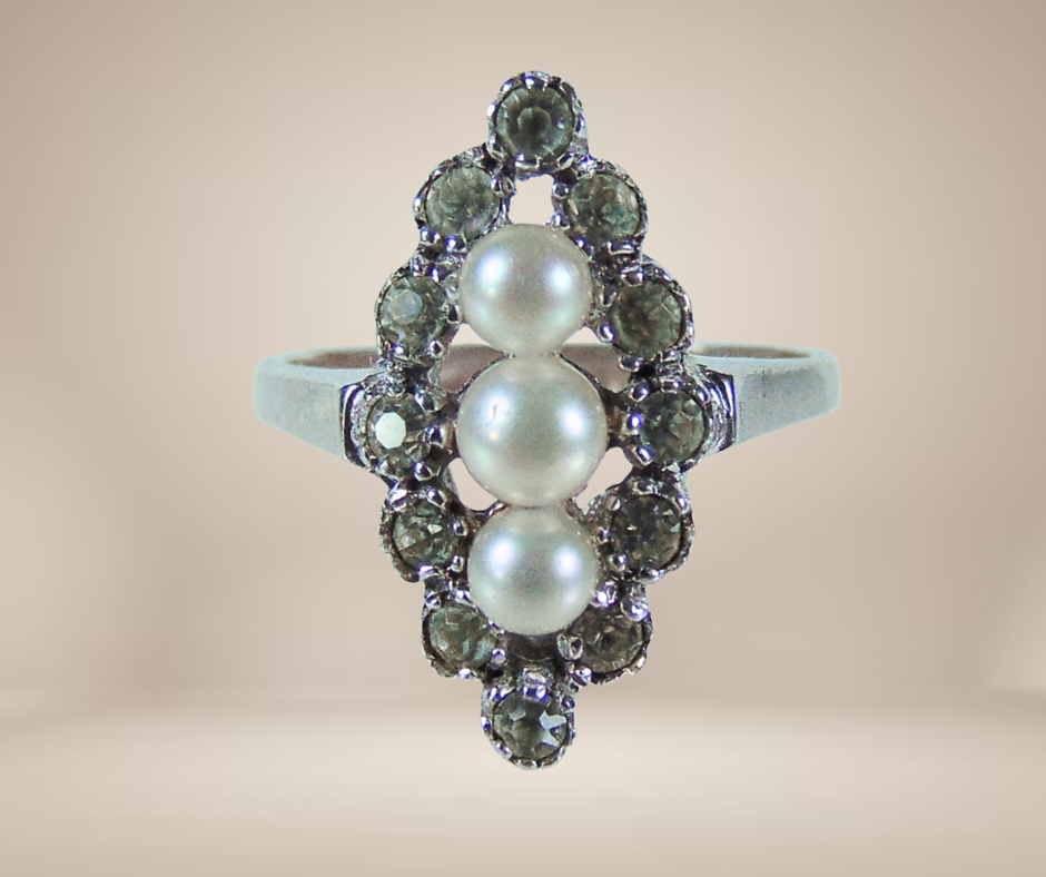Mooie antieke Art Deco zilveren ring, in markiesvorm gezet met sprankelende witte paste steentjes en 3 faux parels.