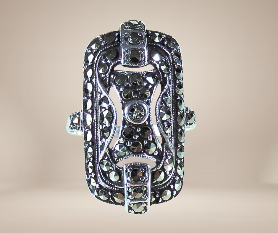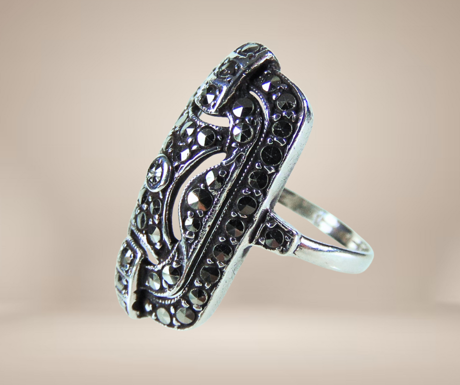 Prachtige kwaliteit zilveren Art Deco ring, gezet met veel markasietjes die je tegemoet sprankelen. Alle steentjes zijn aanwezig, alleen de middelste heeft schade, daarom wel voor een schappelijke prijs.