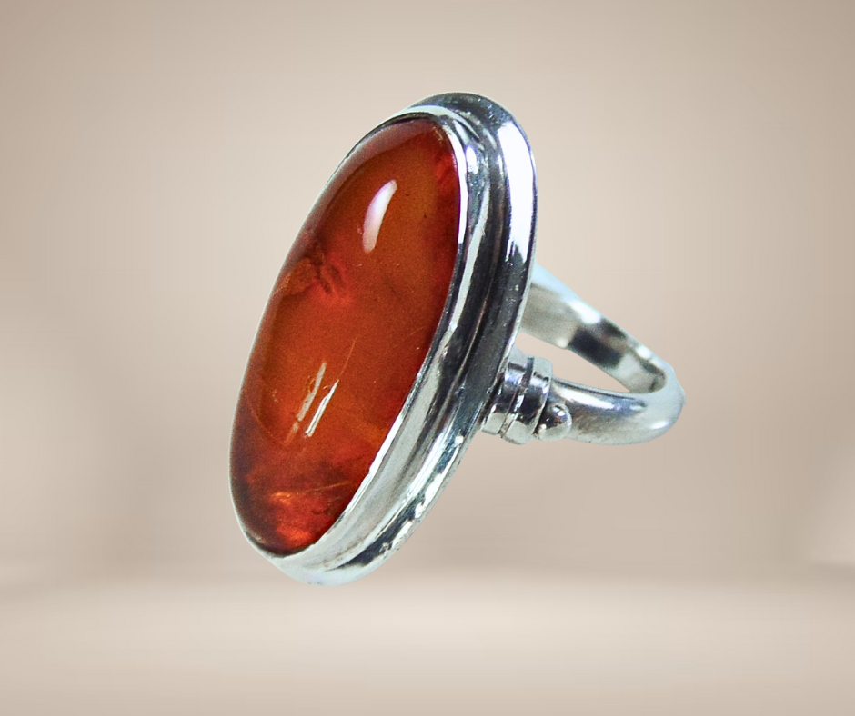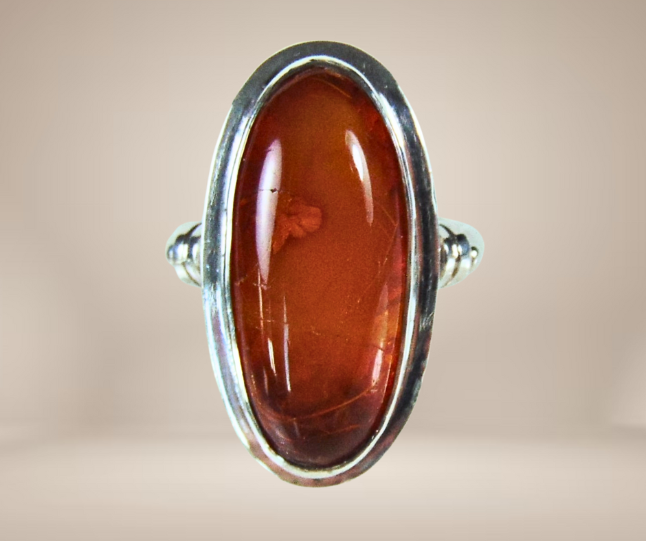 Prachtige strakke zilveren ring uit de Art Deco periode, gezet met een ovale amber cabochon.