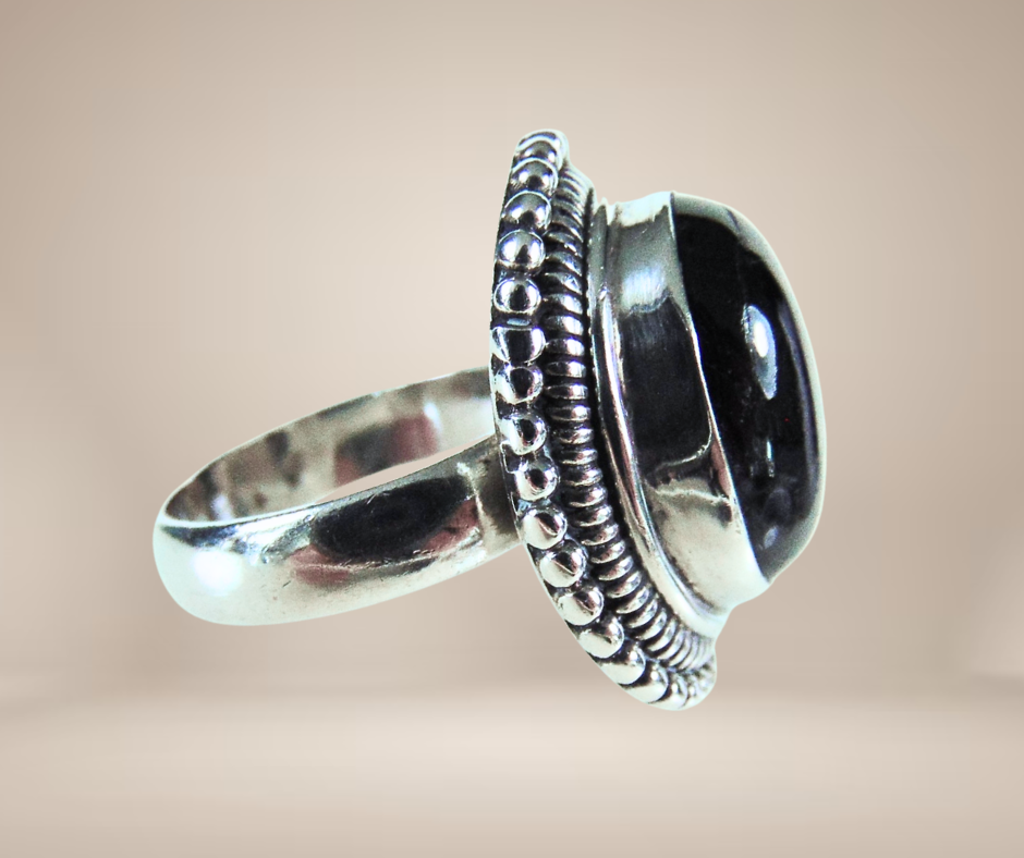 Prachtige nieuwe zilveren ring van een fors formaat en lekker zwaar. De top van de ring is meegevormd met de ronding van de vinger waardoor hij lekker draagt (als een zadel). Hij is gezet met een grote ovale onyx cabochon.