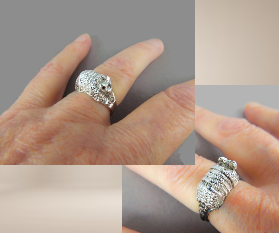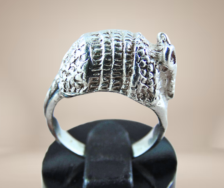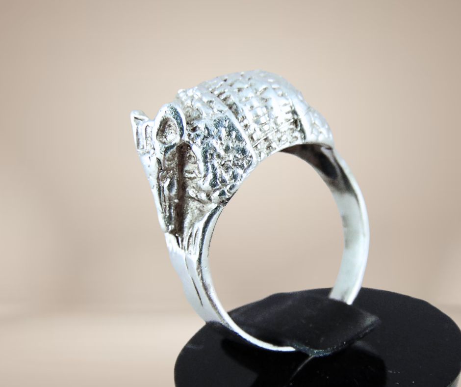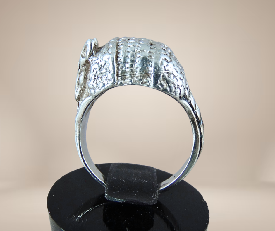 Prachtige handgemaakte zilveren ring in de vorm van een armadillo of gordeldier. Het is een opvallende ring die is gemaakt van hoogwaardig zilver en hij heeft een prachtig gedetailleerd ontwerp. Deze ring is een perfect cadeau voor jezelf of voor iemand die van dieren en natuur houdt. De bolle vorm van de ring omsluit je vinger mooi en biedt een comfortabele pasvorm.